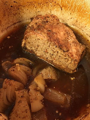 Place your pork tenderloin and onion into your dutch oven (or roasting pan with lid or heavy foil to trap heat).
